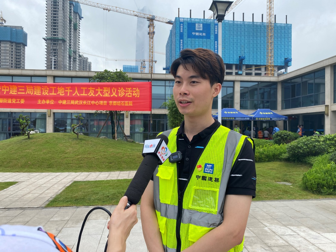 中建三局武漢長(zhǎng)江中心項(xiàng)目黨支部副書(shū)記黃業(yè)發(fā)接受記者采訪