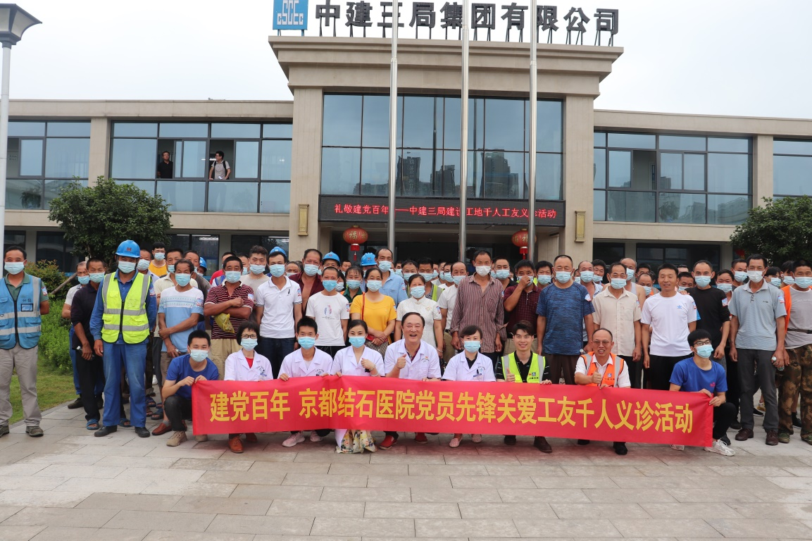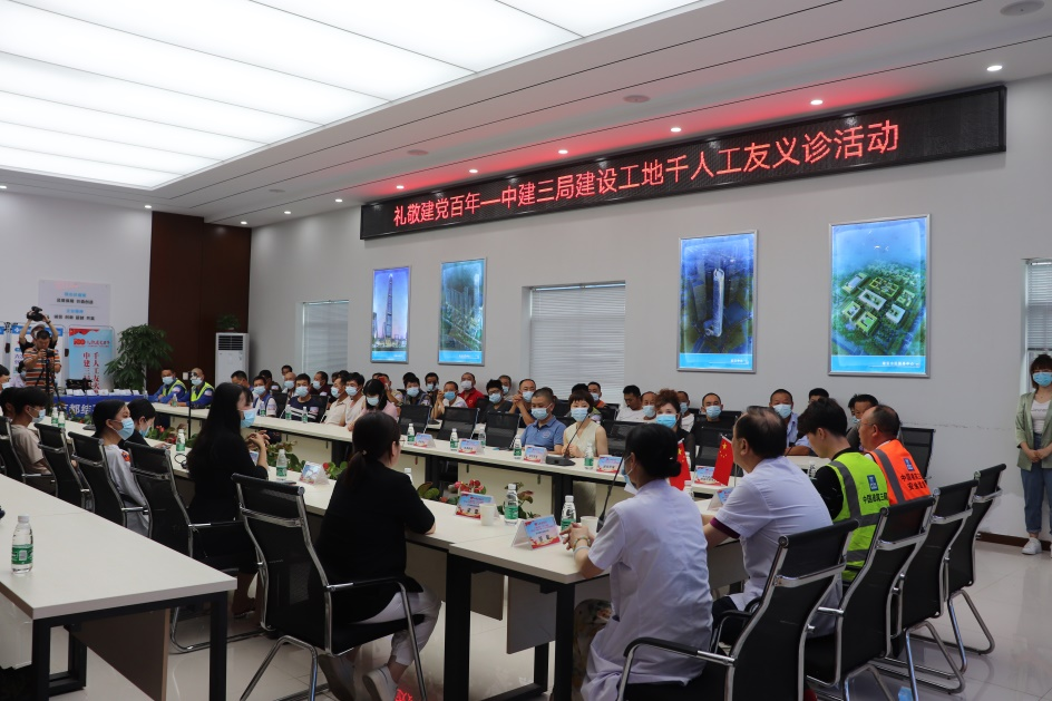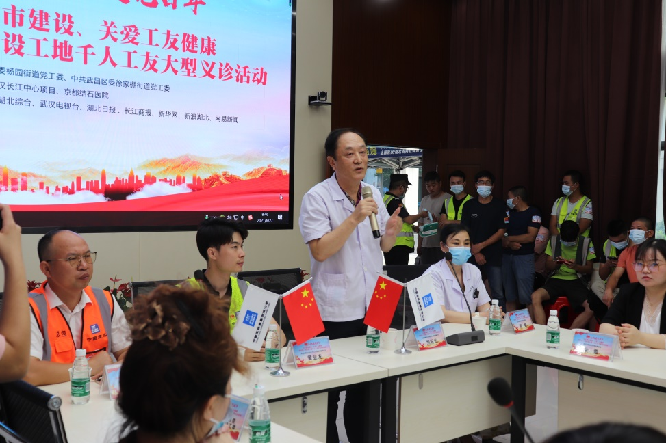 為熱烈慶祝中國(guó)共產(chǎn)黨建黨100周年,扎實(shí)推進(jìn)黨史學(xué)習(xí)教育,踐行“我為群眾辦實(shí)事”實(shí)踐活動(dòng),切實(shí)關(guān)愛(ài)建筑工友的身體健康,6月27日上午,中建三局武漢長(zhǎng)江中心項(xiàng)目聯(lián)合武漢京都結(jié)石醫(yī)院,開(kāi)展“關(guān)注城市建設(shè)·關(guān)愛(ài)工友健康”千人工友大型義診活動(dòng)(以下簡(jiǎn)稱(chēng)“千人義診”活動(dòng))。中建三局武漢長(zhǎng)江中心項(xiàng)目黨支部副書(shū)記黃業(yè)發(fā)、安全總監(jiān)黎長(zhǎng)貴,武漢京都結(jié)石醫(yī)院黨支部書(shū)記劉陽(yáng)光以及數(shù)百名建筑工人代表共同出席了啟動(dòng)儀式。